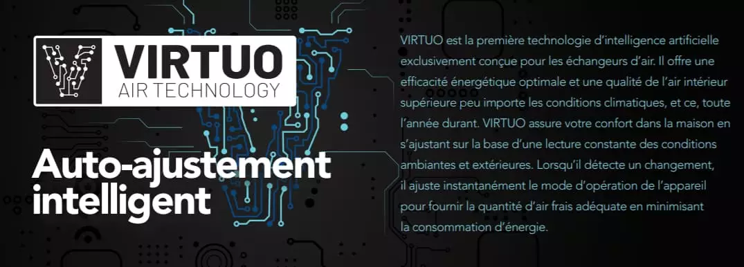 Contrairement aux anciennes générations d’échangeurs d’air, VIRTUO s’ajuste de manière continue en tenant compte de chacune des variations afin de procurer en tout temps un balancement optimal, ce qui maximise le rendement de récupération de votre VRC/VRE et optimise la qualité de l’air. Le propriétaire en retire un maximum d’économies et de confort.